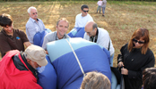 MuntatgeEns trobem a l’Aeròdrom de La Cerdanya, on fem un cafè de bon dia tots junts i ens preparem per al muntatge del globus.